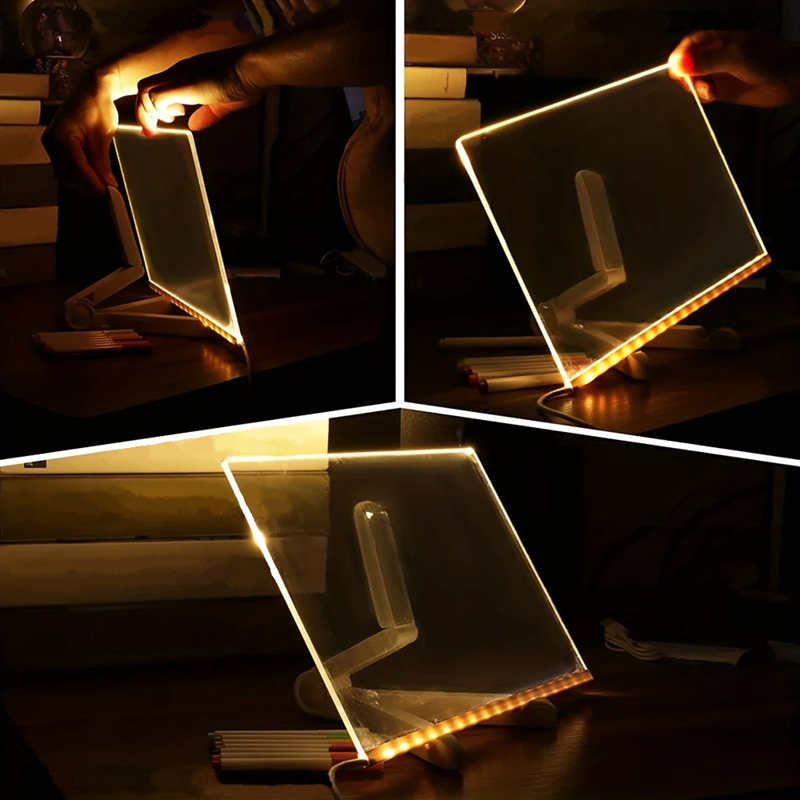 LED háttérvilágítású akril rajztábla 20x30 cm USB gyerekeknek törölhető tábla asztali tartóval és 7 színes vízbázisú filccel