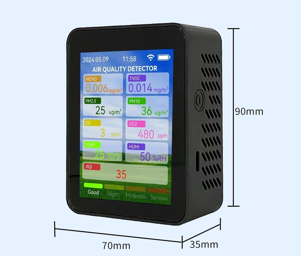 Ez a multifunkcionális légminőség-mérő a levegő állapotának részletes figyelésére szolgál otthonokban, irodákban, gyerekszobákban, autókban és egyéb zárt terekben. Az eszköz valós időben értékeli a káros anyagok és éghajlati értékek széles spektrumát, és áttekinthetően megjeleníti azokat a színes kijelzőn. Kompakt méretének és beépített akkumulátorának köszönhetően ideális mindennapi hordozásra, mind pedig hosszú távú egy helyen történő elhelyezésre. Az eszköz rendkívül érzékeny érzékelőket használ, amelyek biztosítják a magas mérési pontosságot, stabil teljesítményt és gyors reakciót a levegőminőség változásaira. A több szellőzőnyílással rendelkező konstrukció lehetővé teszi a folyamatos levegőáramlást, így a mért értékek megfelelnek a valós környezetnek.