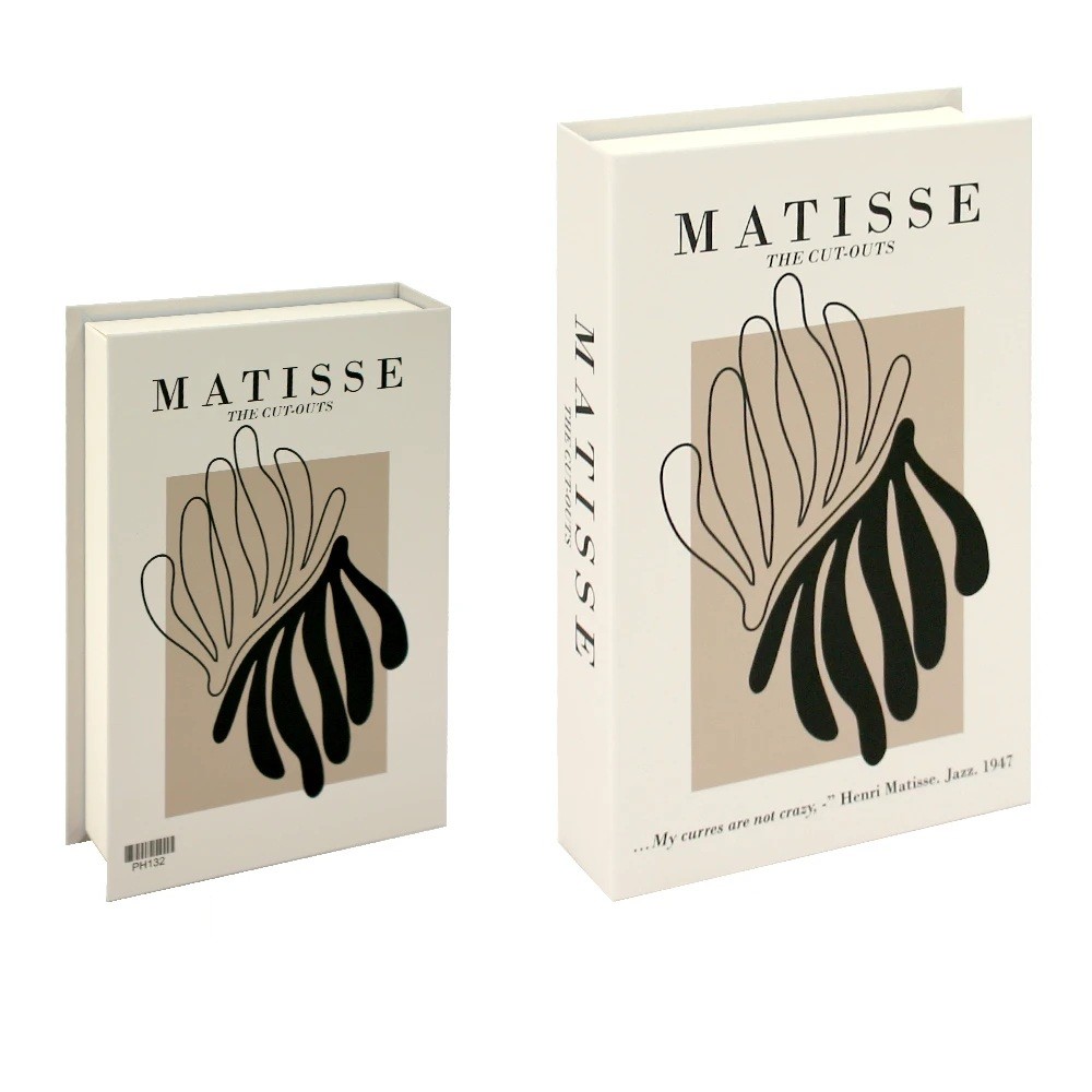 Neotevárható könyv utánzat Matisse The Cut-Outs mintával. Elegáns bézs dekoráció művészi stílusban polcra vagy komódra. Teljes leírás