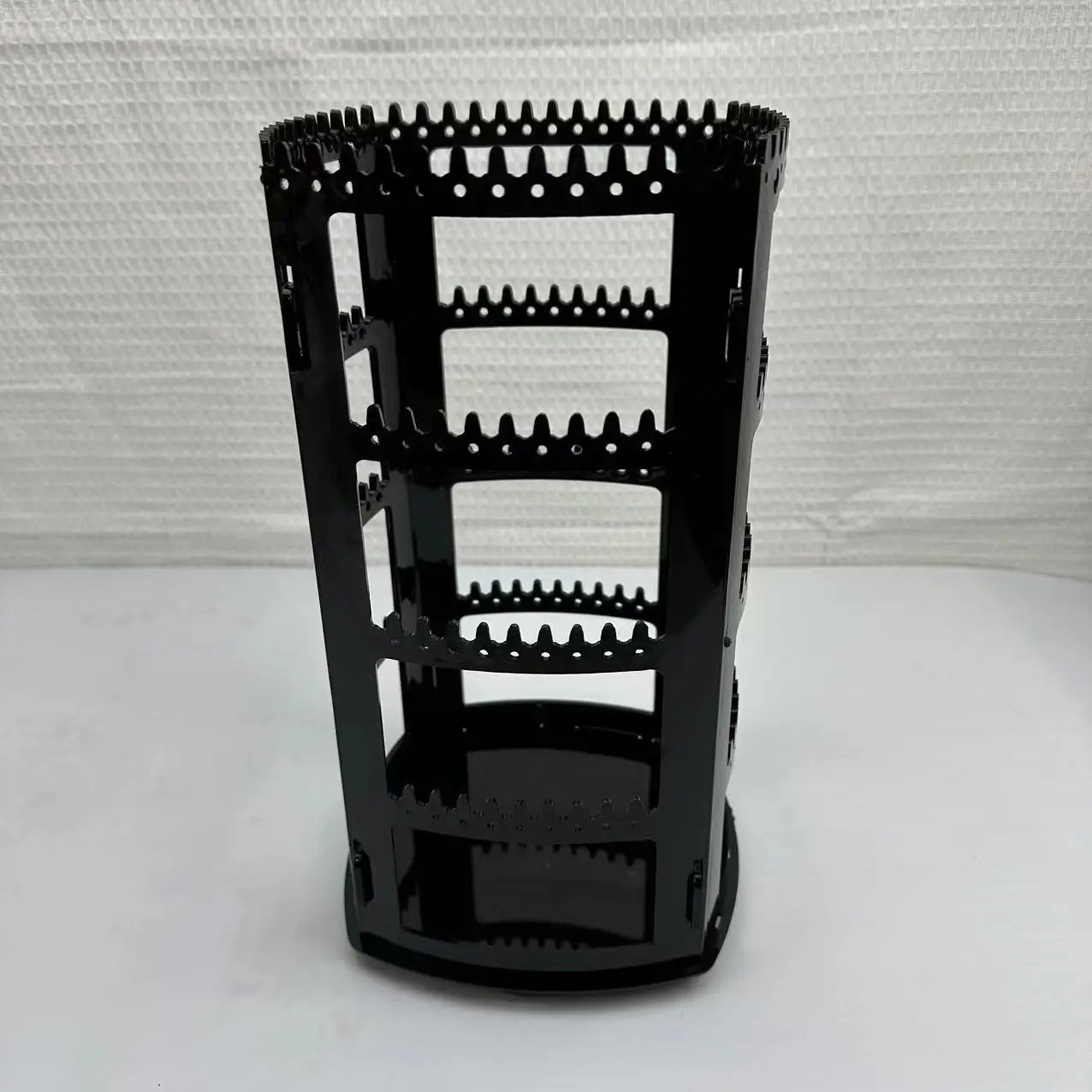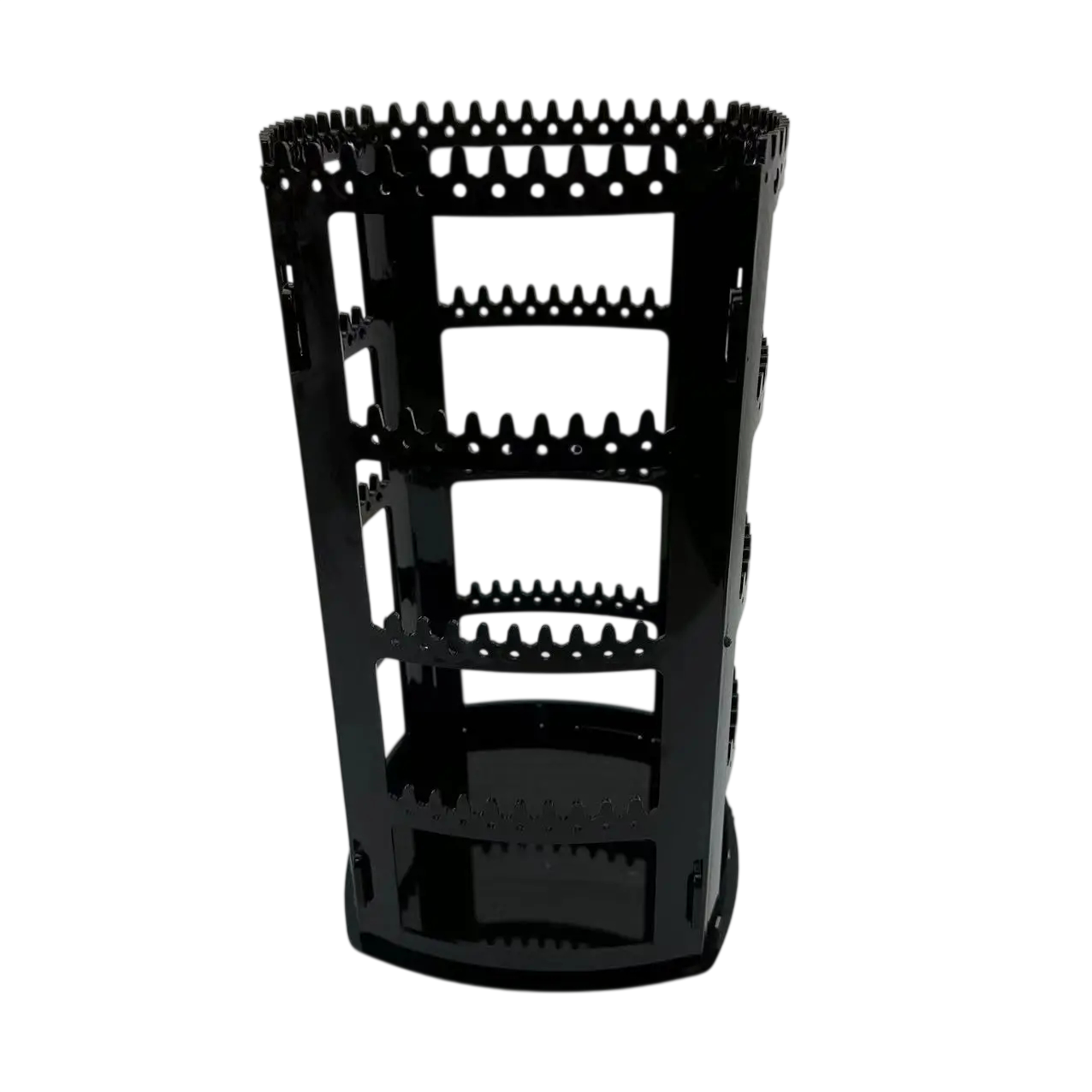 A műanyag fülbevaló állvány a nagyobb mennyiségű ékszer áttekinthető kiállítására lett tervezve egy helyen. A konstrukció több szintű tartókat tartalmaz, amelyek lehetővé teszik a fülbevalók különböző oldalról való akasztását. Az forgatható alap segítségével az állvány könnyen forgatható, így gyorsan választható ki a kívánt ékszer. Az átlátszó kivitel lehetővé teszi, hogy az ékszerek jól láthatóak legyenek minden oldalról. Az állvány mérete 29,5 × 16 × 16 cm, amely alkalmas asztalra vagy sminkasztalra való elhelyezésre.