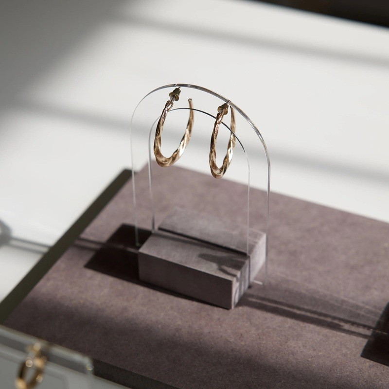 Egyszerű állvány fülbevalók akasztására ívelt formával és stabil alapzattal, amely alkalmas ékszerek kiállítására az asztalon. Teljes leírás