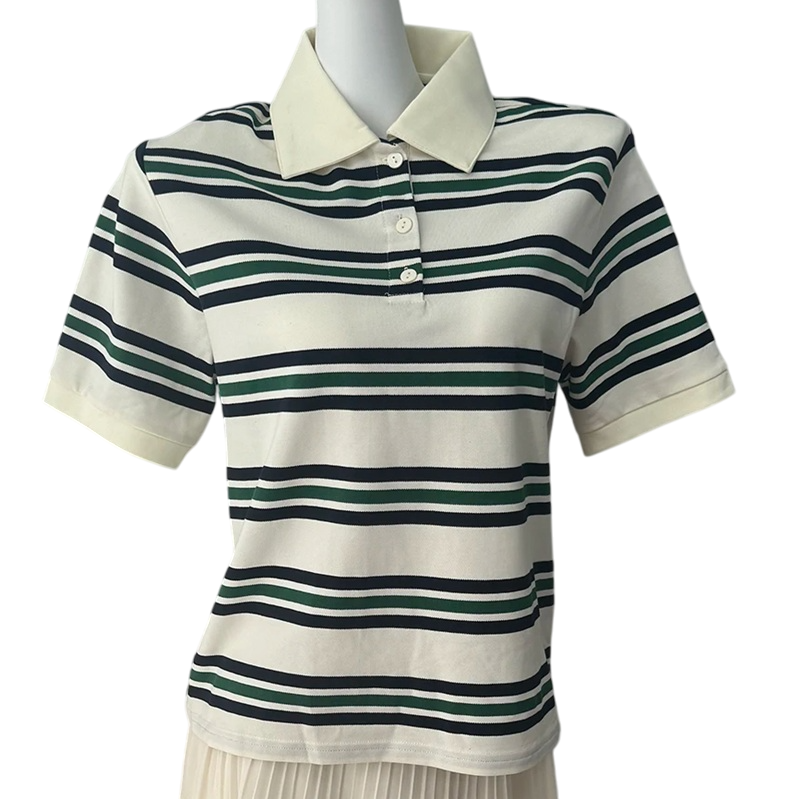 Női csíkos galléros póló Elegáns pamut póló nyakkivágással Laza retro stílusú póló