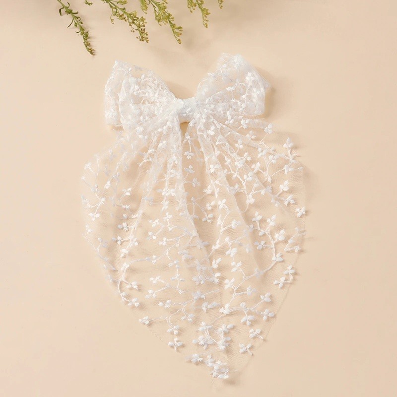 Az elegáns csipkés hajmasni hosszú tüllszalaggal kifejező és romantikus kiegészítő a ünnepi frizurákhoz. A körülbelül 14 × 30 cm méretének köszönhetően hangsúlyos hatást kelt, amely gyönyörűen érvényesül a leengedett és félig összefogott hajban. A finom virágmintás csipke lágy és légies hatást kelt, így ideális választás az esküvői szezonra vagy más különleges eseményekre.
