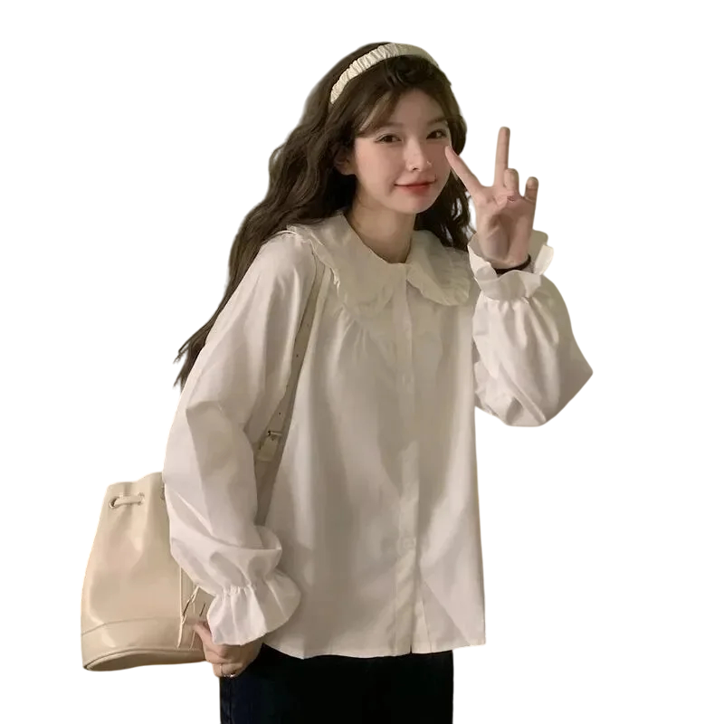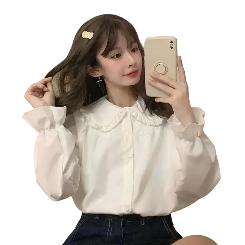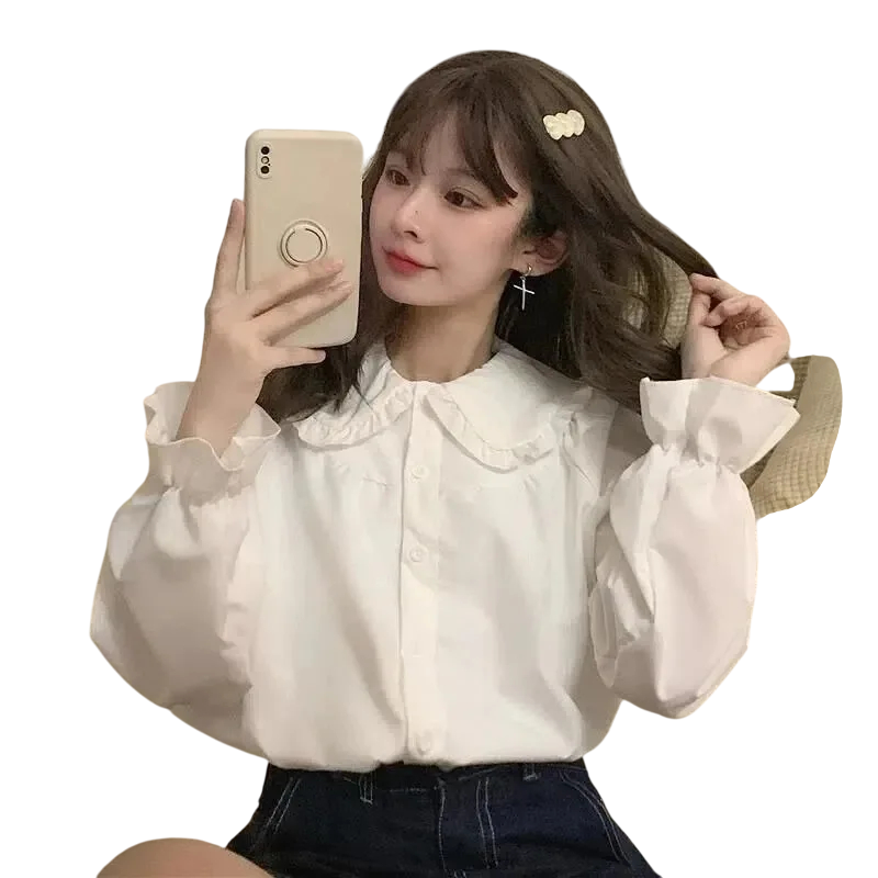 Főoldal Főoldal Ruhák és kiegészítők Női Női ingek Női szabadidős ingek Női fehér elegáns ing hosszú ujjakkal és fodrokkal Stílusos blúz gallérral Gombos záródás Könnyű poliészter anyag