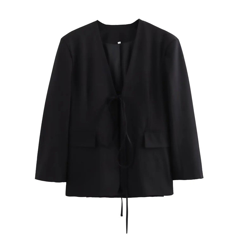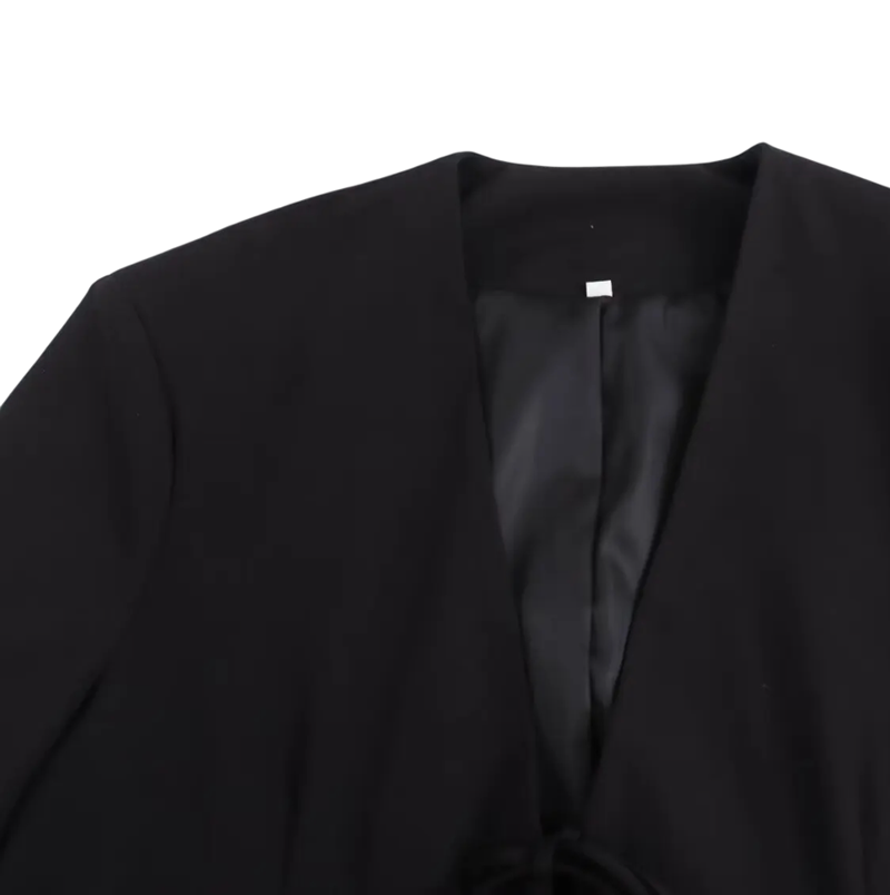 Női fekete elegáns zakó V-kivágással és megkötős pánttal Egyszínű stílusos zakó poliészterből irodába és szabadidőre