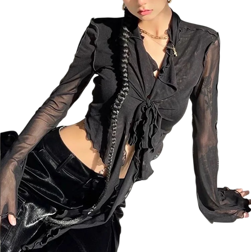 Női félig átlátszó blúz Univerzális méret V-kivágás Hosszú ujjú Ráncolás Kötés a mellkason Elegáns