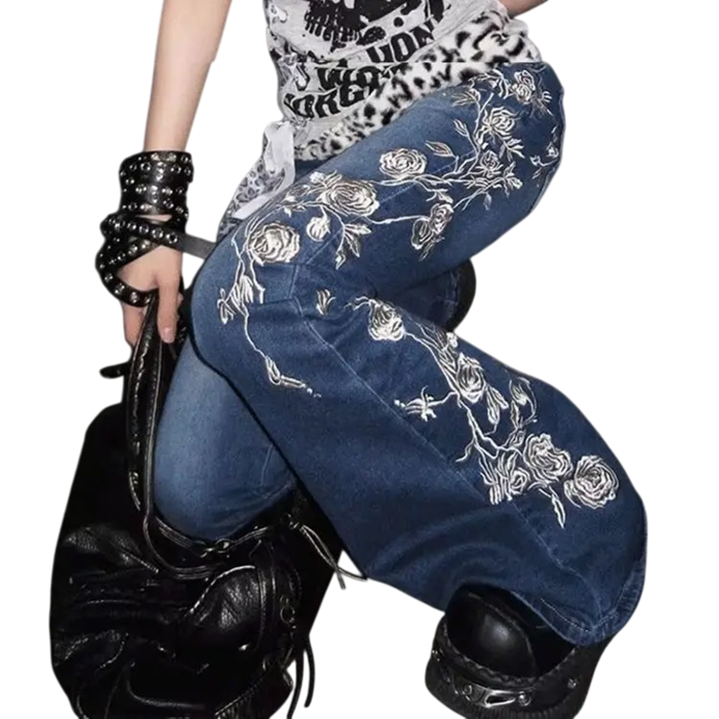 Főoldal Főoldal Ruhák és kiegészítők Női Női farmerek Női kék farmernadrág Egyszínű Virágmintás a nadrágszáron Zsebek 100% Pamut Stílusos laza nadrág Modern outfit