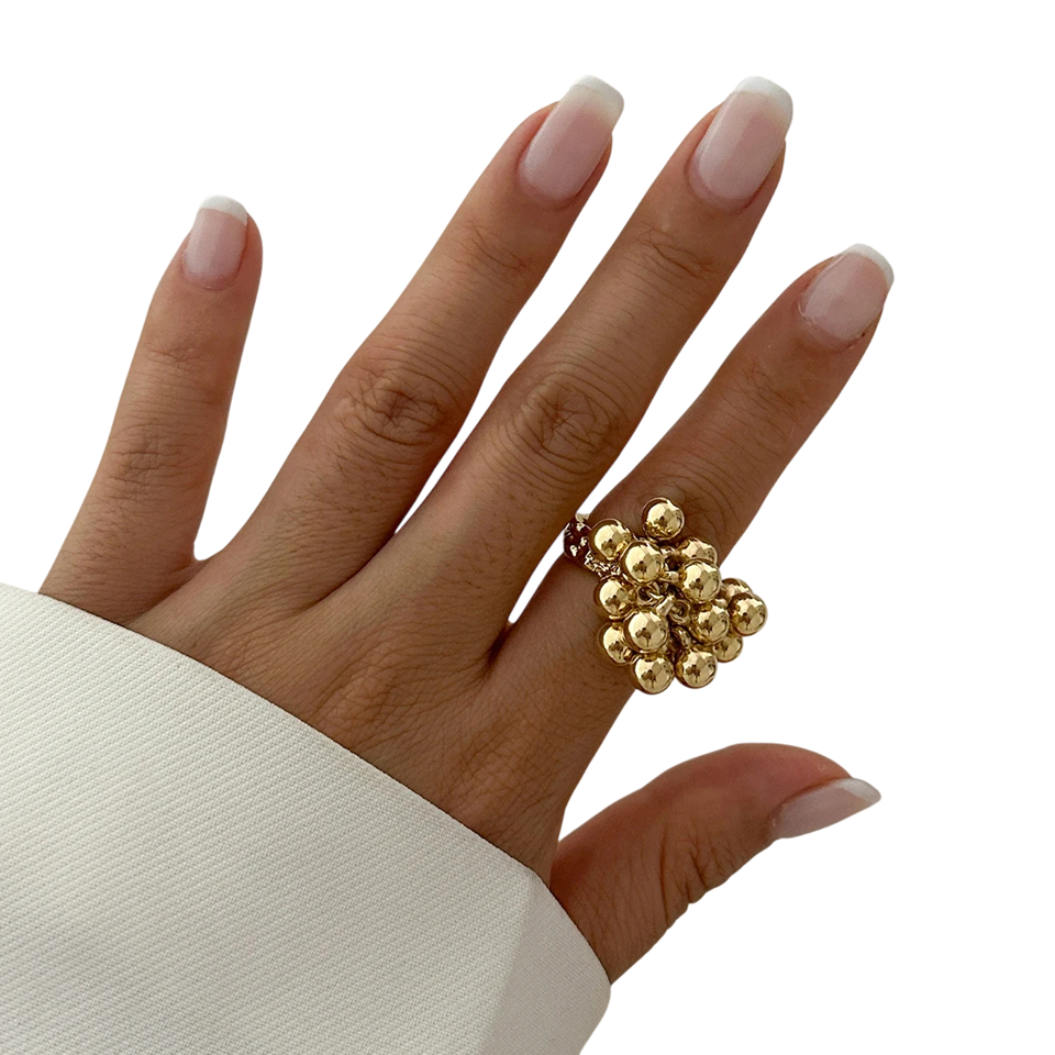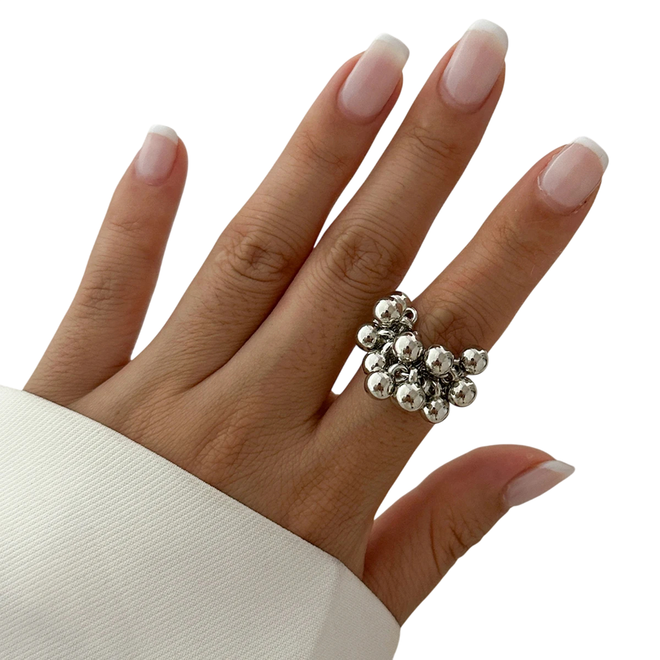 Női gyűrű eredeti golyós mintával, amely modern ékszer, alkalmas mindennapi viseletre és különleges alkalmakra. Szokatlan aszimmetrikus dizájnja elegáns és egyben nagyon stílusos megjelenést kölcsönöz. A nyitott kivitel lehetővé teszi a méret könnyű alkalmazkodását, ami növeli a viselés kényelmét. A gyűrű ideális választás azoknak a nőknek, akik minimalista, de mégis kifejező divatkiegészítőt keresnek. Kiválóan kiegészíti a formális és szabadidős öltözetet.