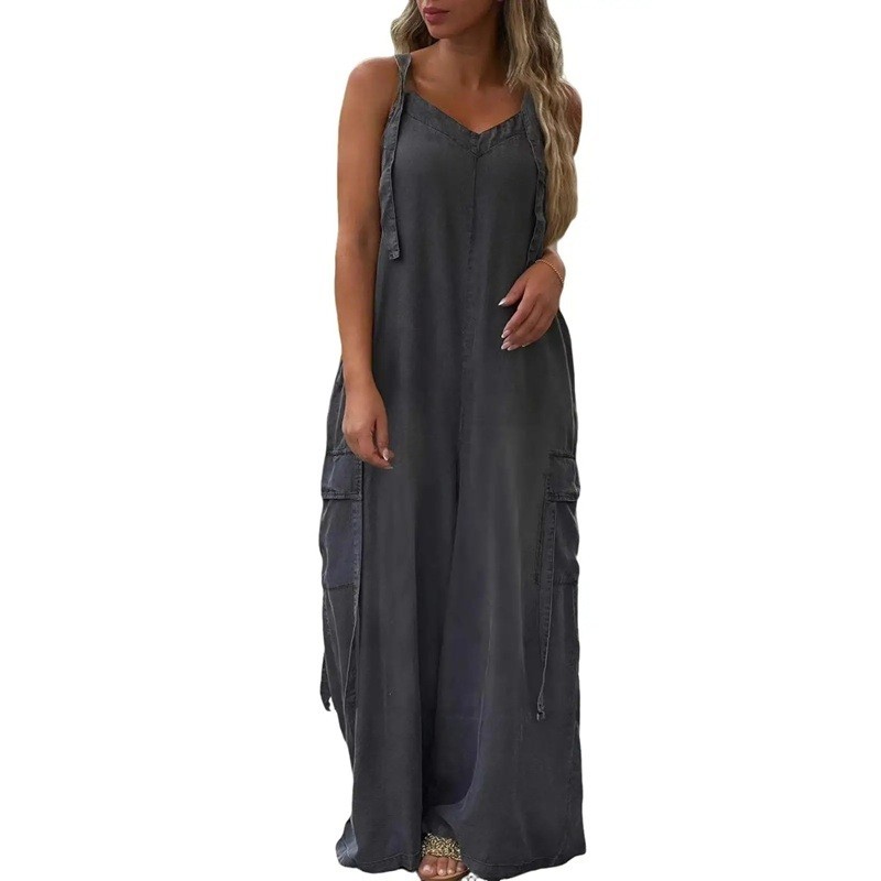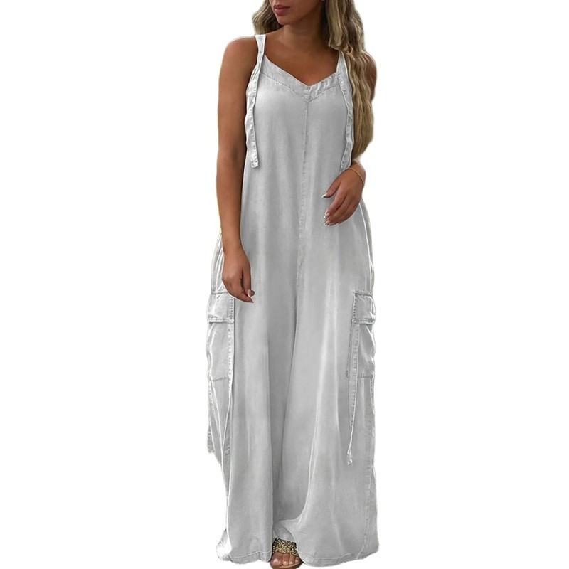 Könnyű női overál laza szabással, amely egész nap kényelmet biztosít, praktikus zsebekkel és egyszerű egyszínű dizájnnal, amely nyáron ideális. Teljes leírás