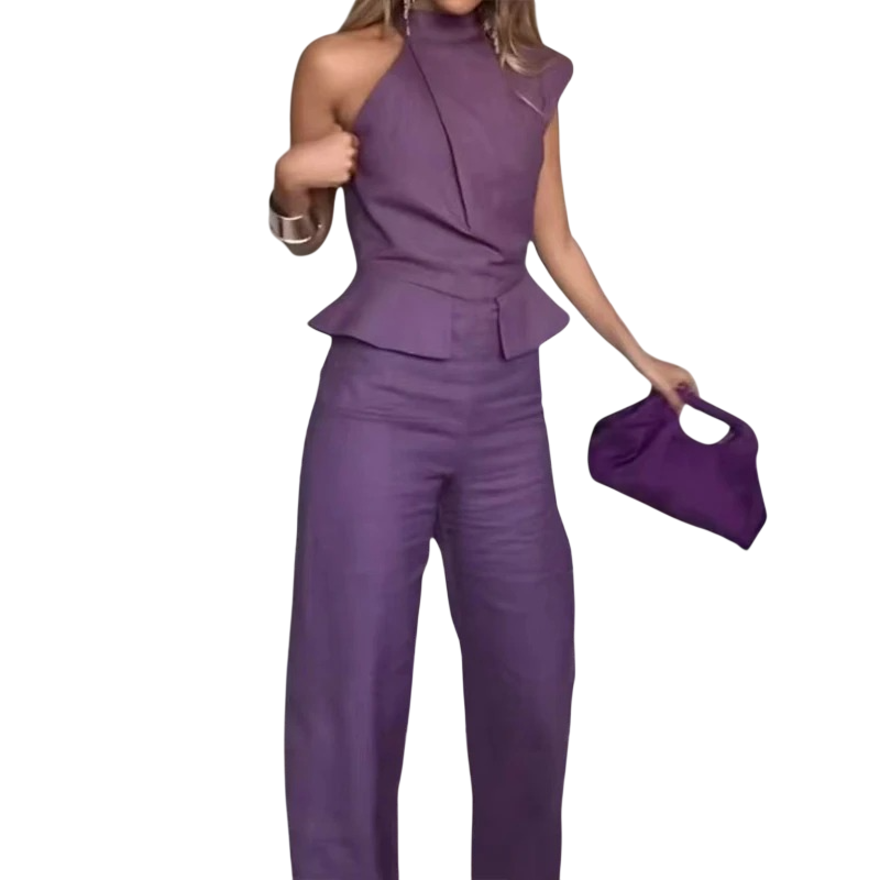 Női overál lila O nyakkivágással Hosszú nadrág Ujjatlan széles pántokkal Aszimmetrikus szabás Könnyű poliészter