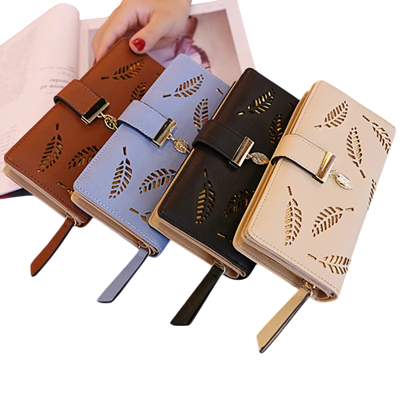 Stílusos női pénztárca elegendő hellyel a kártyák és készpénz számára, hangsúlyos arany levelek mintával és praktikus záródással. Teljes leírás