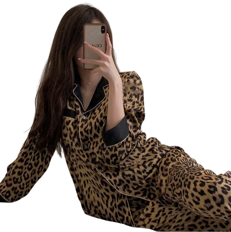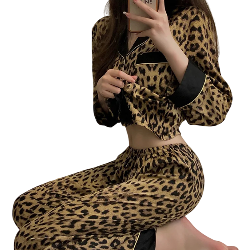 Ez az elegáns női pizsama szett ötvözi a kényelmet, a stílust és a modern dizájnt. Kiváló minőségű poliészter és spandex keverékből készült, amely kivételes puhaságot, rugalmasságot és légáteresztő képességet kínál. A leopárdminta vonzó és merész megjelenést kölcsönöz a modellnek, amely kiemeli minden nő egyedi stílusát. A felső rész gallérral, zsebecskével a mellen és gombos záródással rendelkezik, így elegáns és ízléses hatást kelt. A laza szabású nadrágok biztosítják a kényelmes viselést és a mozgásszabadságot – ideális alváshoz és otthoni pihenéshez.