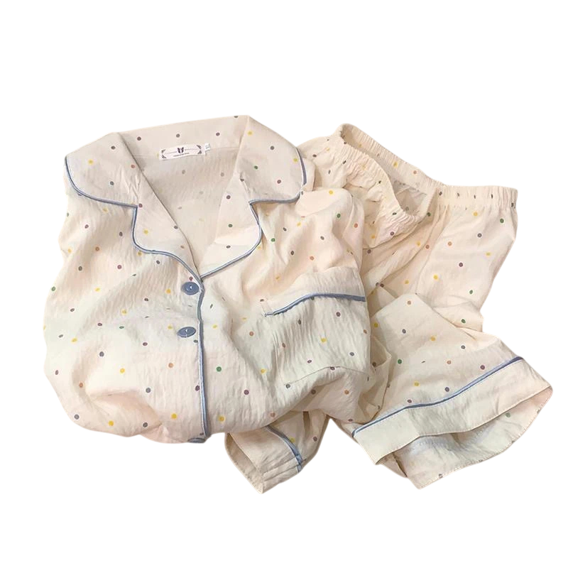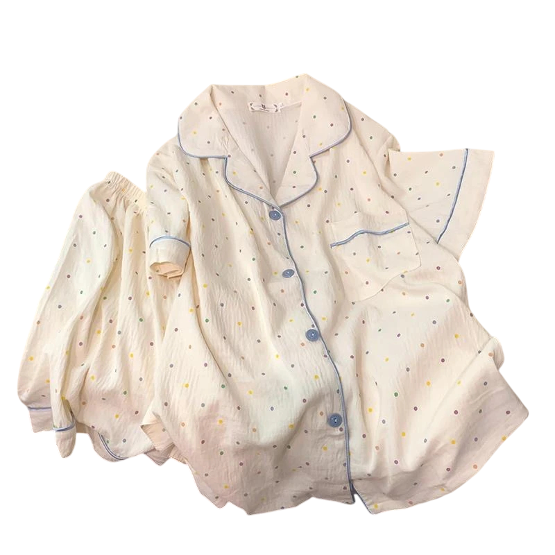 Női pizsama pöttyös Fehér gombos póló gallérral és zsebecskével a mellen, valamint puha poliészterből készült rövidnadrág Elegáns nyári szett