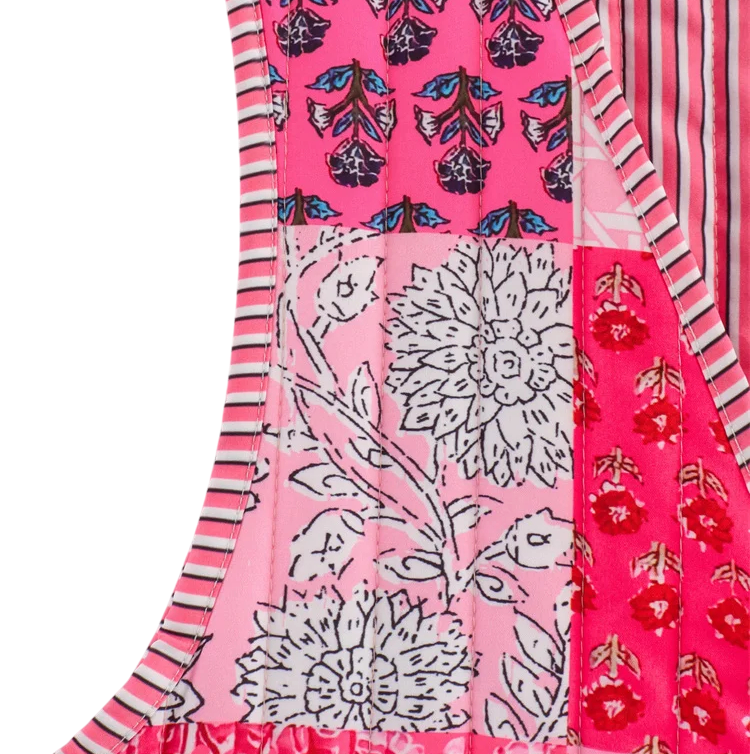 Elegáns női mintás mellény rózsaszín-piros árnyalatokban V kivágással és zsinórral megkötve. Könnyű, stílusos és kényelmes kiegészítő. Teljes leírás