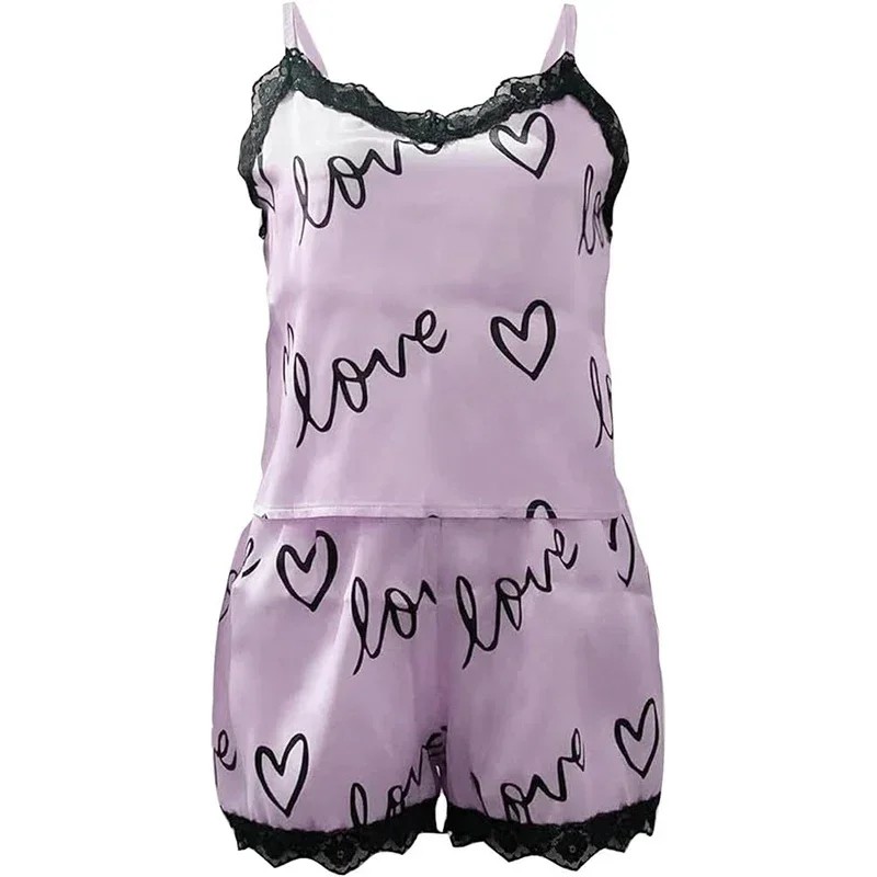 Női selyem pizsama csipkés szegéllyel Egyszínű szívmintás és Love feliratos Póló V-kivágással és rövidnadrág poliészterből és spandexből