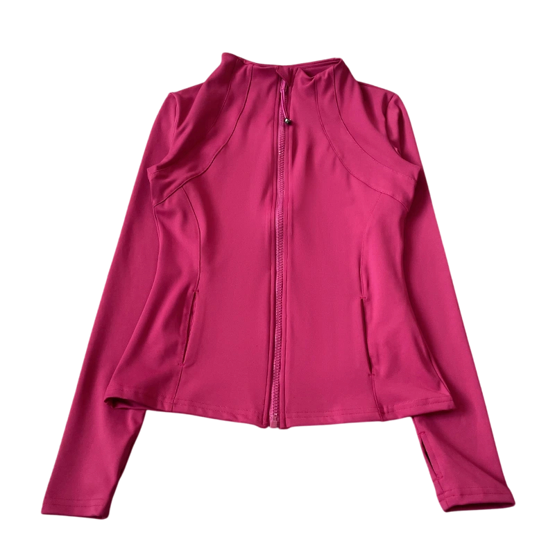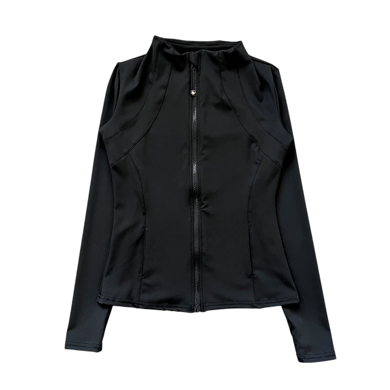 Női sportdzseki állógallérral Karcsúsított szabás Gyorsan száradó, légáteresztő anyag Hüvelykujj-lyuk Belső mobiltelefon-zseb