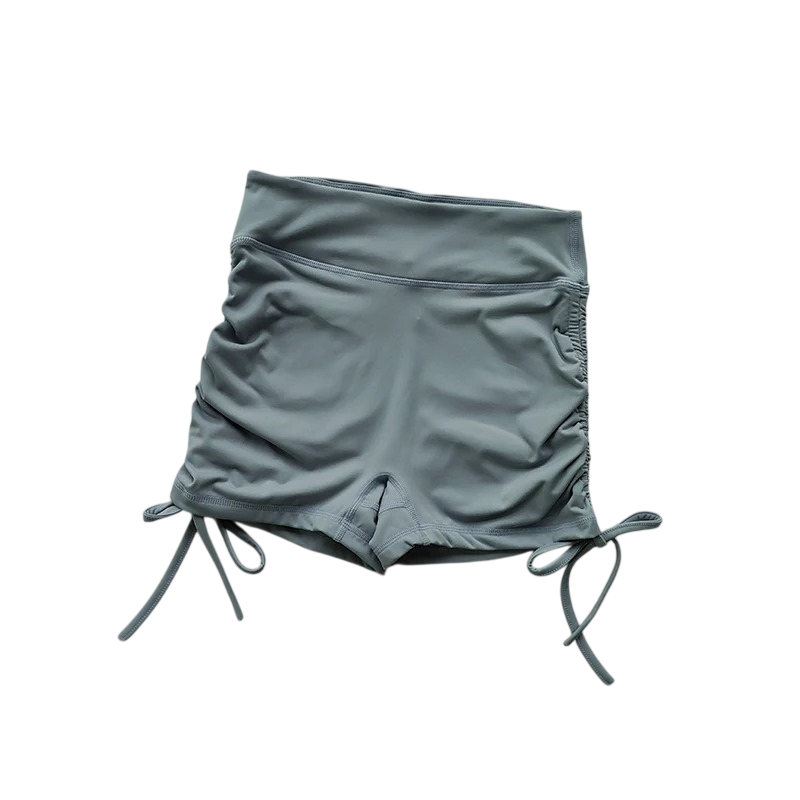 Könnyű sportos rövidnadrág ráncolással és masnival az oldalán nylonból, amely alkalmas futásra, fitneszre és nyári szabadidős viseletre. Teljes leírás