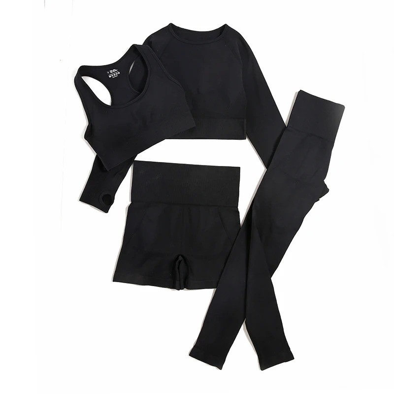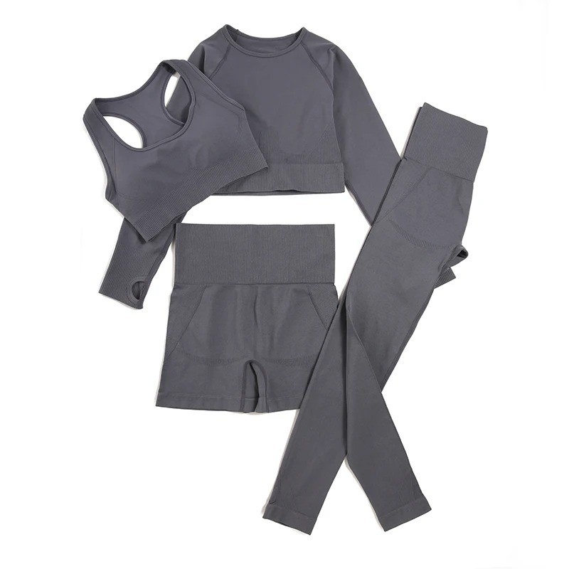 Női sportos szett Leggings, rövidleggings, sportmelltartó és hosszú ujjú póló Egyszínű fitness szett nylonból