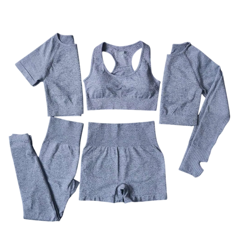 Ez a női sportos szett maximálisan univerzális megoldást kínál azoknak a nőknek, akik bármilyen edzésre és időjárásra fel akarnak készülni. A szett tartalmaz leggingset, rövidleggingsot, sportmelltartót, rövid ujjú pólót és hosszú ujjú pólót, ami lehetővé teszi az egyes részek könnyű kombinálását az aktuális igényeknek megfelelően. Az anyag nylon, poliészter és spandex keverékéből készült, könnyű, rugalmas és kellemes tapintású. Az egyszínű kivitel modern, időtálló és könnyen kombinálható más sportos kiegészítőkkel.
