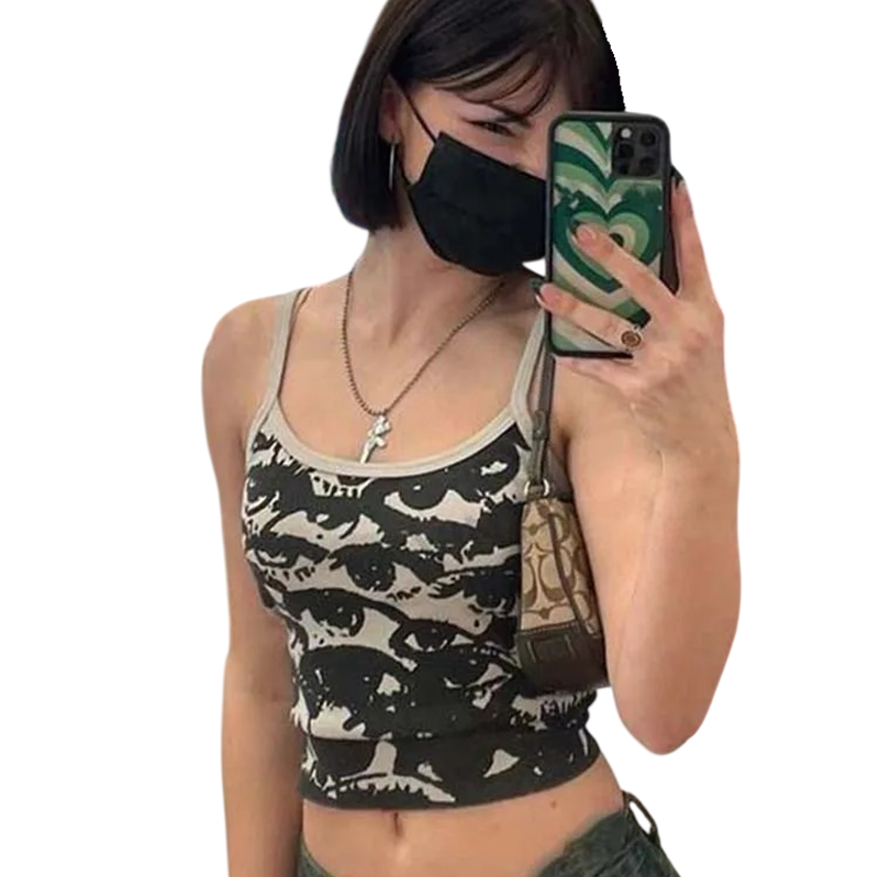 Ez a női trikó ideális választás női számára, akik szeretnék outfitjükkel felhívni magukra a figyelmet és kifejezni egyedi stílusukat. A szürke kivitel, amelyet egyedi szemnyomtatás díszít, modern, feltűnő és egyben könnyen kombinálható. A crop top fazon fiatalos megjelenést kölcsönöz az outfitnek, és kiemeli a derekat. A vékony pántok és a kerek O nyakú kivágás könnyed és kényelmes dizájnt alkotnak, amely alkalmas meleg napokra. A kiváló minőségű anyagnak köszönhetően a trikó kellemes tapintású és kényelmes a hosszú távú viselet során.
