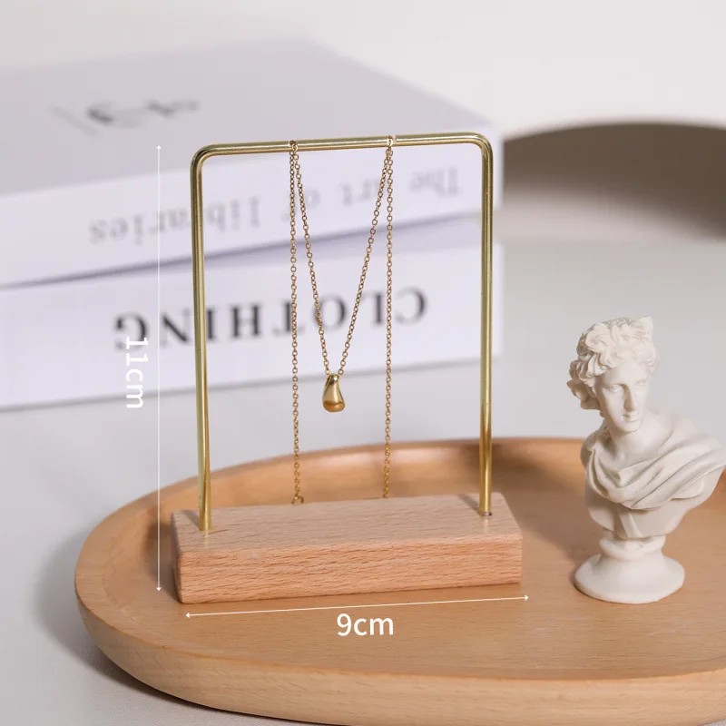 Az asztali nyaklánctartó a ékszerek áttekinthető kiállítására lett tervezve az asztalon vagy polcon. A felső rúddal rendelkező konstrukció lehetővé teszi a nyakláncok egyszerű akasztását, így azok jól láthatóak és könnyen hozzáférhetőek. Az állvány fából készült alappal van kiegészítve, amely biztosítja a stabilitást a mindennapi használat során. A kompakt méret 11 cm magasságú és 9 cm széles, lehetővé teszi, hogy kisebb felületeken is elhelyezhető legyen. A keretes konstrukció helyet biztosít egy vagy több nyaklánc akasztására.