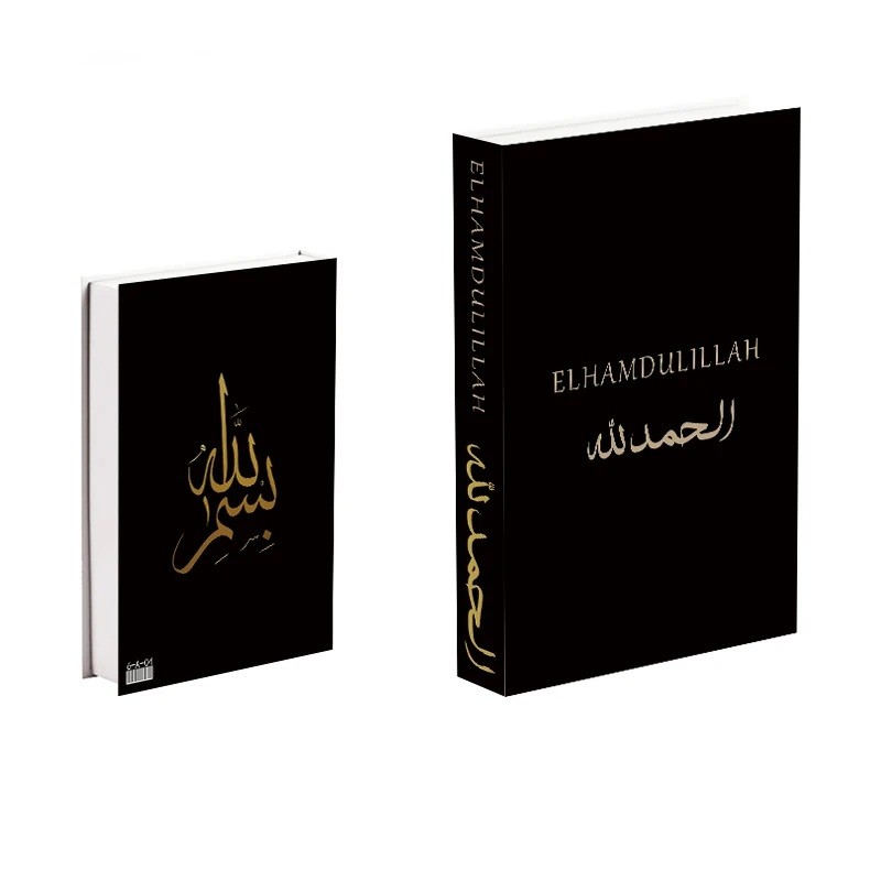 Nyitható hamis könyv Elhamdulillah Fekete luxus dizájn Arany kalligráfia Dekoratív tárolódoboz értékeknek