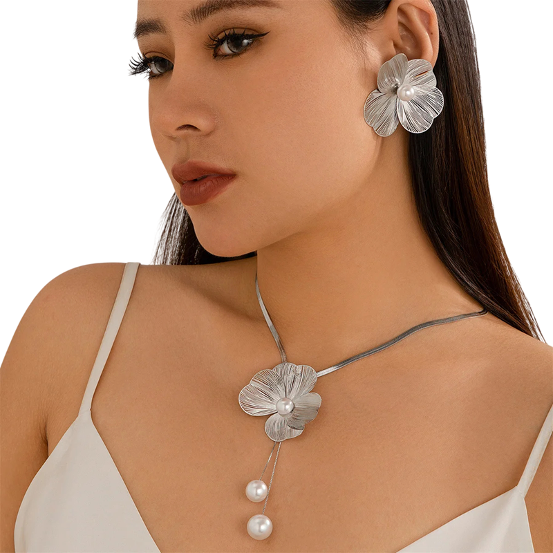 Ez az elegáns szett ideális választás ajándéknak és stílusos kiegészítőnek a saját ékszerdobozba. A virágos motívum hangsúlyozza a nőiességet és finom, romantikus árnyalatot ad az öltözetnek. Az állítható zárnak köszönhetően a nyaklánc alkalmazkodik a különböző dekoltázsokhoz és ruházati stílusokhoz. Ha divatos női ékszereket keres virágos dizájnnal, ez az okvetői szett remek megoldás.