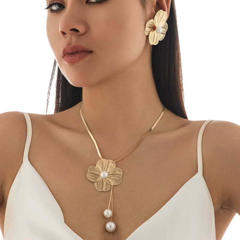 Okvetői szett nyaklánc 42,5+7 cm fülbevaló 5 cm Réz romantikus virágos divatékszerek nőknek Elegáns szett Nyaklánc + fülbevaló
