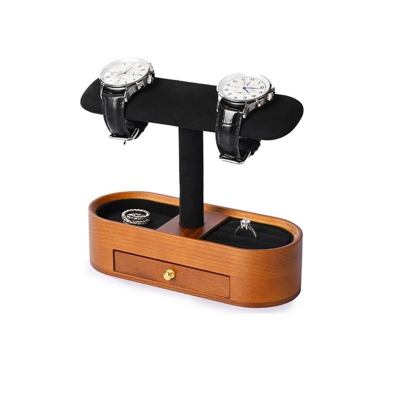 Órák és ékszerek tárolására szolgáló állvány 2 órához, ékszerorganizálóval és fiókkal 20 × 8 × 17 cm, fa állvány műbőr párnával