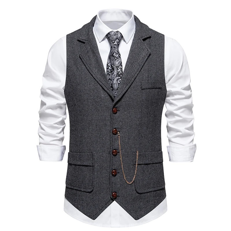 Pánská elegáns vesta lánccal és zsebekkel Egyszínű vesta gallérral gombos Formális társadalmi vesta