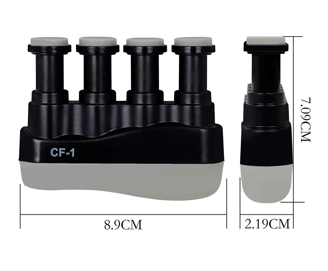 Díky kompaktním rozměrům se posilovač snadno vejde do kapsy nebo obalu na gitár, takže jej můžete používat bármikor és bárhol – otthon, a próbateremben i na útközben. Každý prst má samostatný píst s pružinou, což umožňuje individuální nastavení odporu a přesné zaměření tréninku podle vašich potřeb.