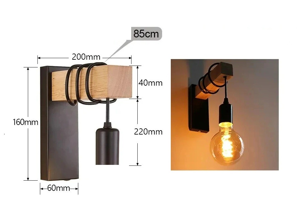 Retro fa LED fali lámpa E27, 220V/110V, ipari világítás hálószobákhoz, fürdőszobákhoz és éttermekhez  Ez a retro fa fali lámpa LED világítással ideális modern és ipari belső terekhez. Hálószobákban, fürdőszobákban, éttermekben és más kereskedelmi helyiségekben való használatra tervezve, ez a lámpa kifinomult és vintage megjelenést kölcsönöz a térnek. A fa alap és a fém szerkezet nagyszerű kontrasztot alkot, amely különböző dekorációs stílusokhoz illik. A lámpa E27 foglalattal van felszerelve, amely kompatibilis különböző LED izzókkal (izzó nem tartozék). 220V vagy 110V táplálással működik, ami széleskörű használhatóságot biztosít különböző országokban. A lámpa dizájnja lehetővé teszi a falra való egyszerű telepítést, így ideális a hely fölé, tükör mellé vagy dekoratív világításként a folyosóra. A különböző izzók használatának lehetősége (sok stílusban és színben elérhető) lehetővé teszi, hogy az igényeknek megfelelően testre szabja a fény intenzitását és színét. A telepítés nagyon egyszerű, és a lámpa hosszú élettartamot kínál.