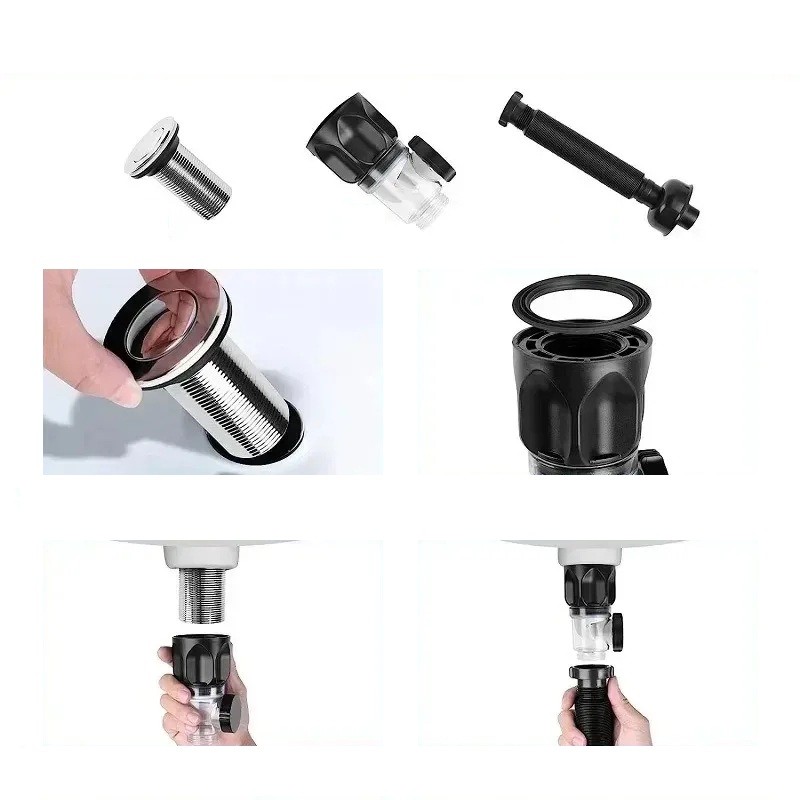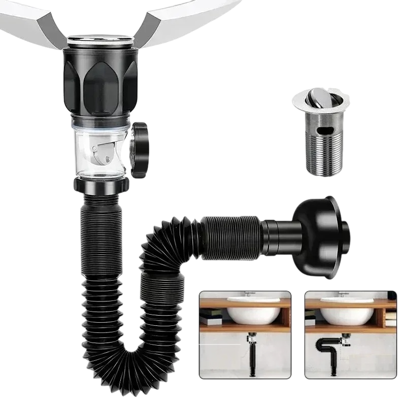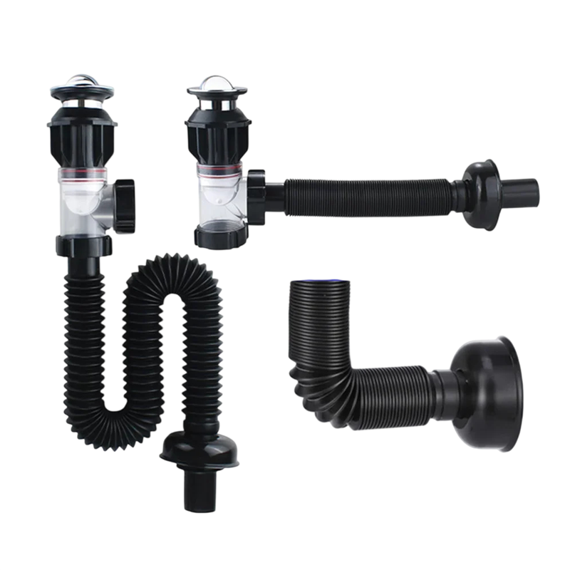 Ez a lefolyórendszer praktikus funkcionalitást és anyagellenállást ötvöz, biztosítva ezzel a hatékony és tartós megoldást a háztartási lefolyók számára. A fekete dizájn elegáns integrációt tesz lehetővé a belső térbe anélkül, hogy felesleges helyet foglalna el. A rugalmas cső könnyen alkalmazkodik a mosdó alatti különböző térbeli lehetőségekhez, minimalizálva a további módosítások szükségességét. A telepítés gyors és egyszerű, ami időt és munkát takarít meg a szerelés során.
