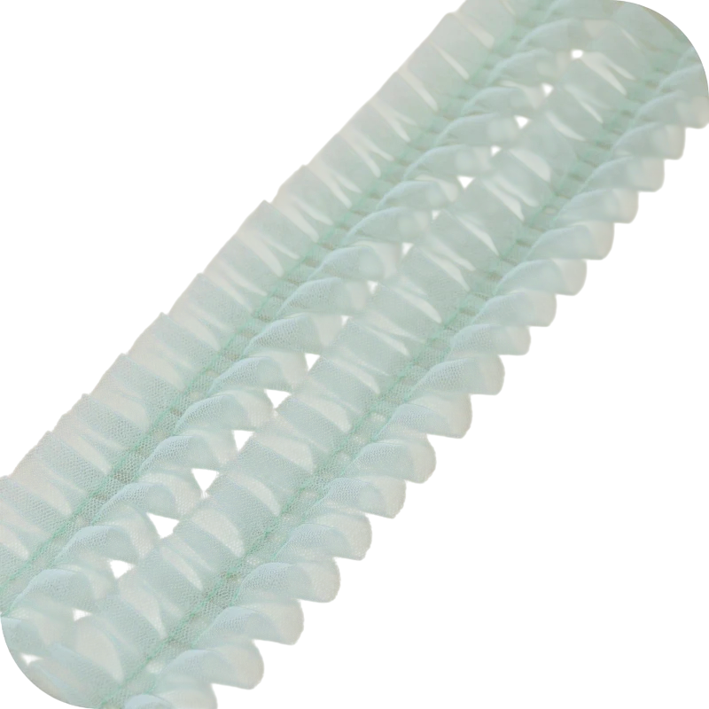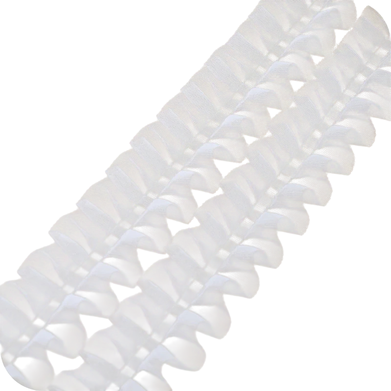 A kiváló minőségű tylból készült anyag könnyű, rugalmas és jól alkalmazkodik a különböző projektekhez. A csipke ráncolt dizájnja hangsúlyos dekoratív hatást teremt, amely különösen romantikus és esküvői dekorációkhoz illik. Szerkezete miatt a csipke alkalmas ruhák, szoknyák, blúzok vagy gyerekruha díszítésére.