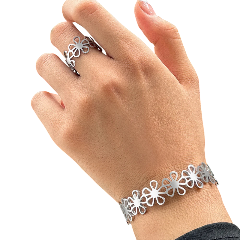 Ez a szokatlan retro karkötő és gyűrű szett eredeti üreges virág mintájával és időtlen dizájnjával vonzza a figyelmet. Az ékszerek magas minőségű rozsdamentes acélból készültek, amely tartós, ellenálló és hosszú távú viselésre alkalmas. A felület fakulásmentes, megőrzi megjelenését és fényét a mindennapi használat során is. Az állítható méret lehetővé teszi, hogy a gyűrű és a karkötő könnyen alkalmazkodjon a különböző kéztípusokhoz, ami kényelmet és rugalmasságot biztosít. A retro virágos dizájn egyedi karaktert kölcsönöz az ékszereknek, így stílusos kiegészítővé és eredeti ajándékká válik.
