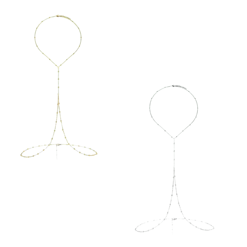 Ez a szexi testlánc gyöngyökkel egy figyelemfelkeltő divatkiegészítő, amely összeköti a nyak és a derék területét egy elegáns egységgé. Az átgondolt kialakítás vizuálisan vonzó vonalat hoz létre, amely kiemeli a női sziluettet, és magabiztos nyári jelleget ad az öltözetnek. A 91 + 9 cm hosszú hasi lánc kényelmesen alkalmazkodik a testalkathoz, míg a 71 + 9 cm hosszú nyaklánc stabil és stílusos rögzítést biztosít. A nyak és a has közötti összekötő lánc 20 cm hosszú, amely egyedi összekapcsolási hatást teremt, és eredeti megjelenést ad az ékszernek. Ez a vízálló és minimalista testékszer ideális választás bikinikhez, strandra, fesztiválokra és nyári bulikra.