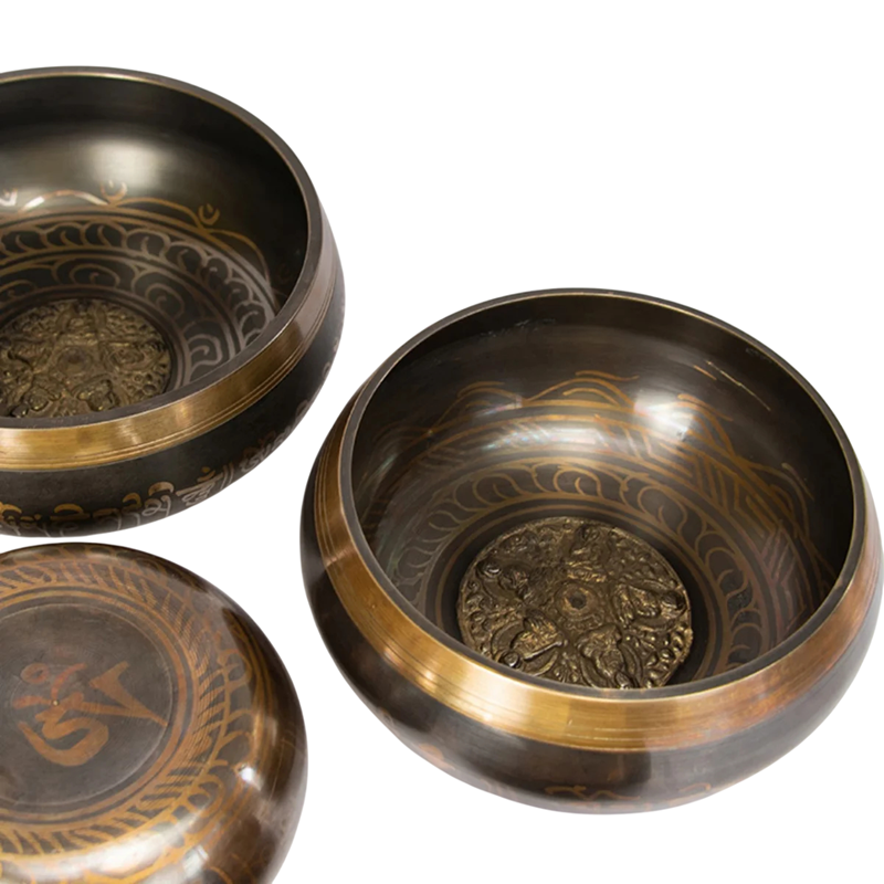 Tibeti éneklő tálak készlete 8,5 cm tibeti írással, párnával és bőr ütővel meditációhoz, jógához, relaxációhoz, csakralevélhez és imához