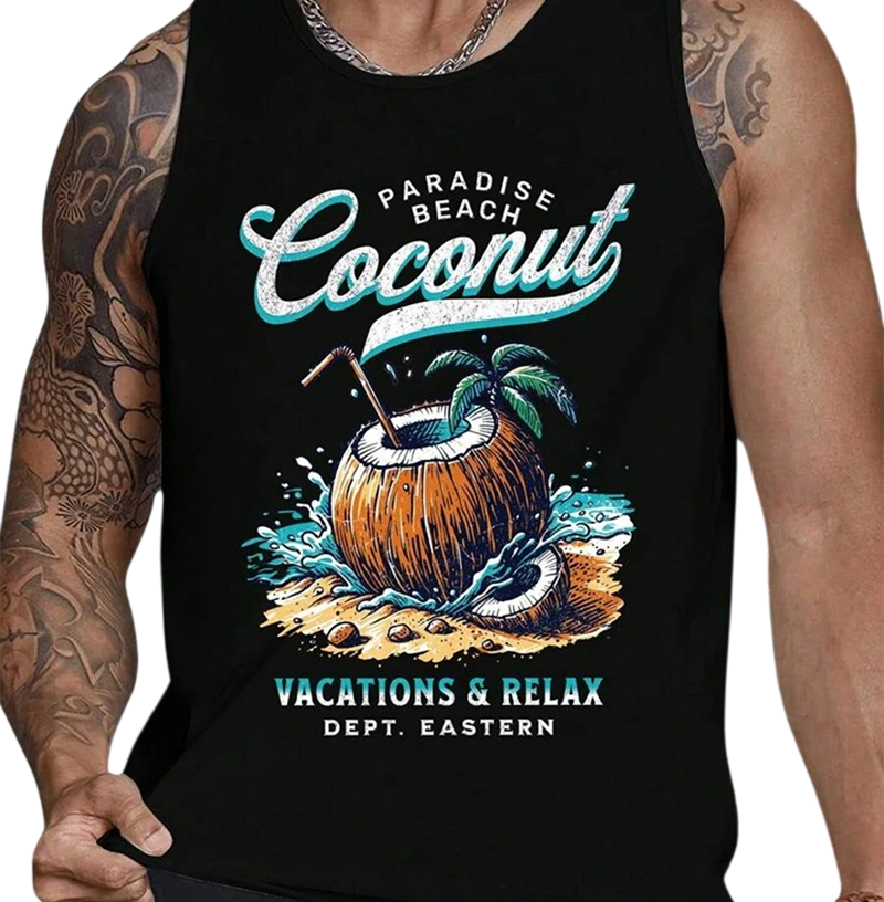 Nyári férfi ujjatlan póló poliészterből, kókusz és strand mintával, amely könnyedséget, kényelmet és friss trópusi stílust kínál szabadidőre és nyaralásra. Teljes leírás