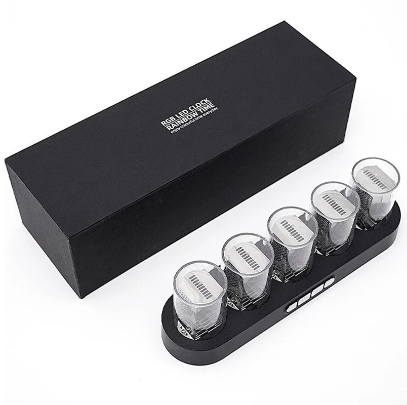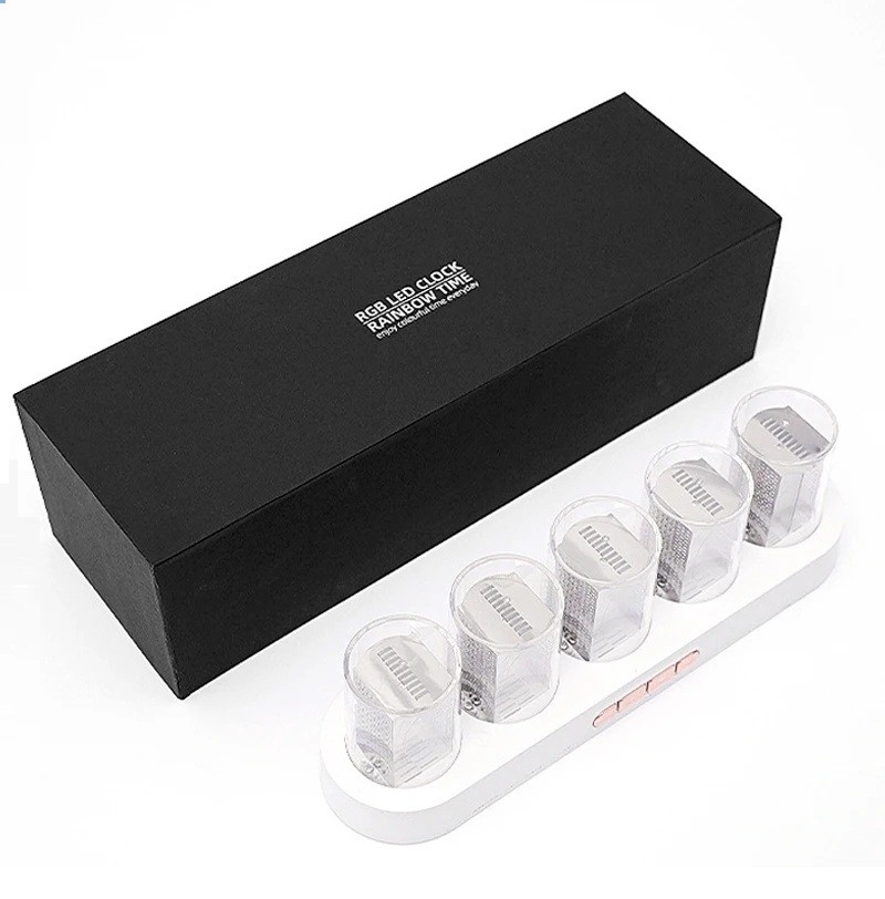 Trubicový ébresztőóra színes fényekkel 268 x 69 x 79 mm méretben, USB tápegységgel, tápkábellel és használati útmutatóval. Ideális modern belső terekhez. Teljes leírás