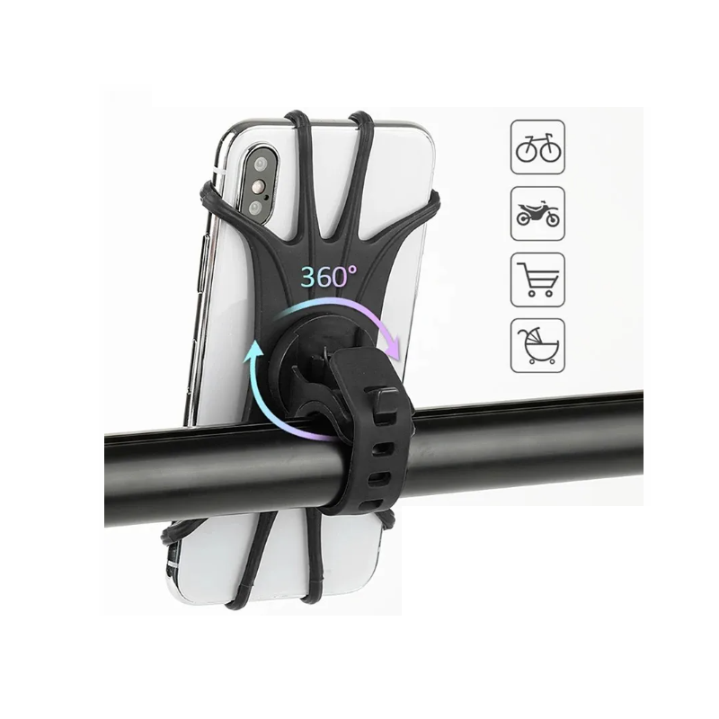 Silikon telefon tartó 360°-ban forgatható csuklóval. Alkalmas kerékpárra, motorra és babakocsira, különböző méretű mobilokkal kompatibilis. Teljes leírás