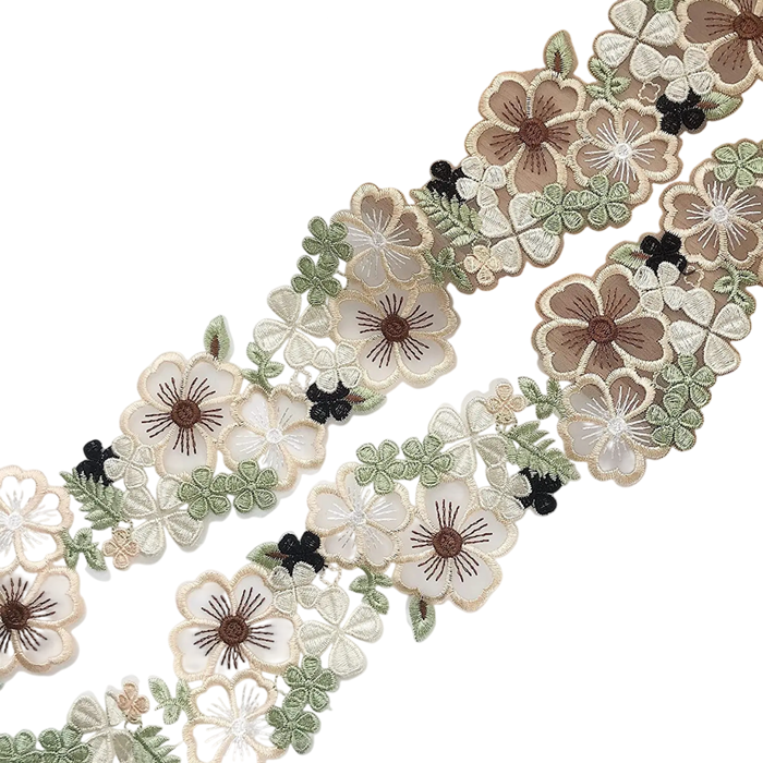 A szalag kiváló minőségű poliészterből készült, amely biztosítja az anyag szilárdságát, tartósságát és hosszú élettartamát. A poliészter szál jól megtartja formáját, és könnyen kezelhető varrás vagy díszítés során. A virágmintás csipke finom és elegáns megjelenést ad a termékeknek.